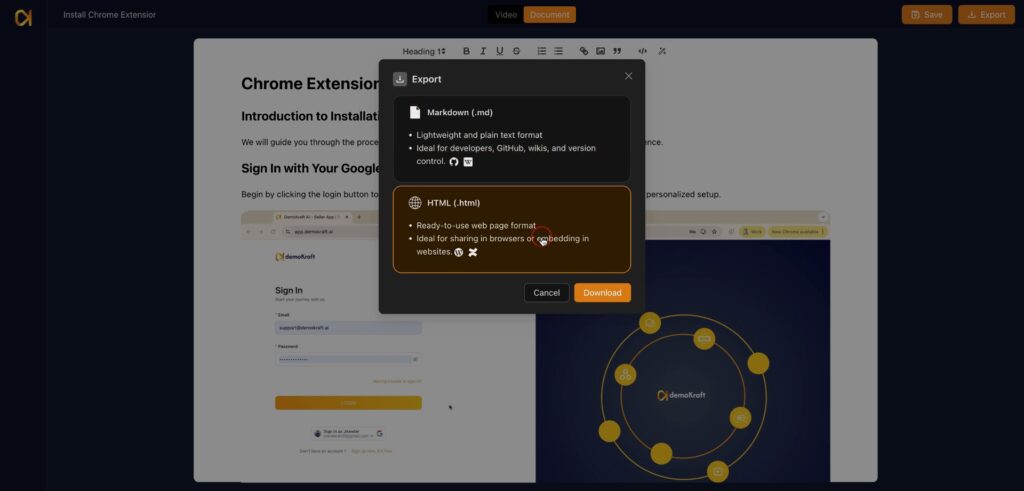 Your document can be downloaded in two formats: Markdown, which works with any Markdown editor, or HTML, which is suitable for viewing in browsers or for web embedding.
