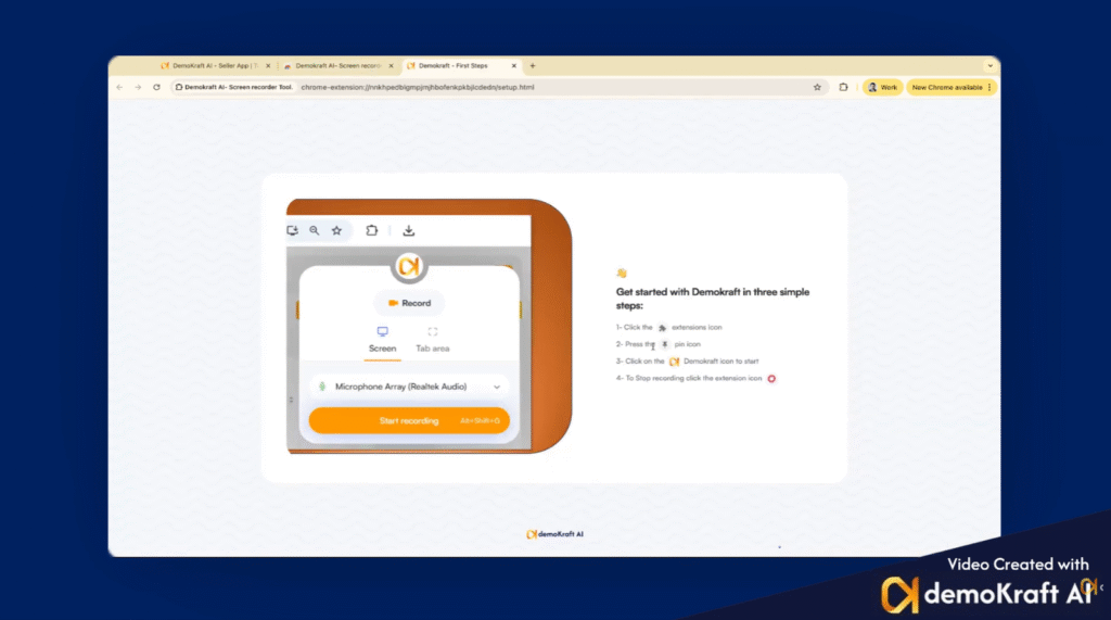 To improve accessibility, pin the DemoKraft icon to your browser toolbar. Simply click the pin icon beside the extension, ensuring that the extension is readily available whenever you need it. After pinning, you can return to the studio interface to continue your work.
