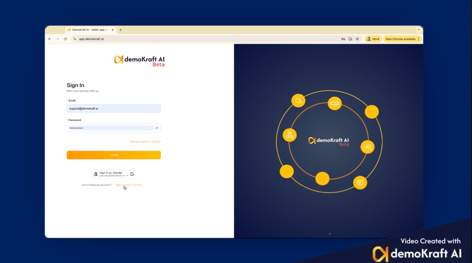 Begin by going to the DemoKraft AI page and selecting the ‘Sign Up’ button. This action directs you to a page where you can either log in or create a new account. If you don’t have an account, register using your email and password, or simply log in through your Google account for a streamlined process. For demonstration, we use Google login.