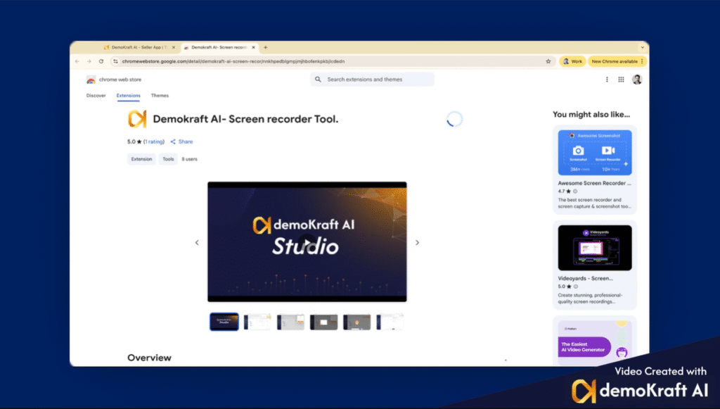 After logging in, the next essential step is to install the DemoKraft Chrome extension. Click on the provided icon to navigate to the Chrome Web Store. There, click ‘Add to Chrome’ and then confirm by selecting ‘Add Extension’ to complete the installation seamlessly.