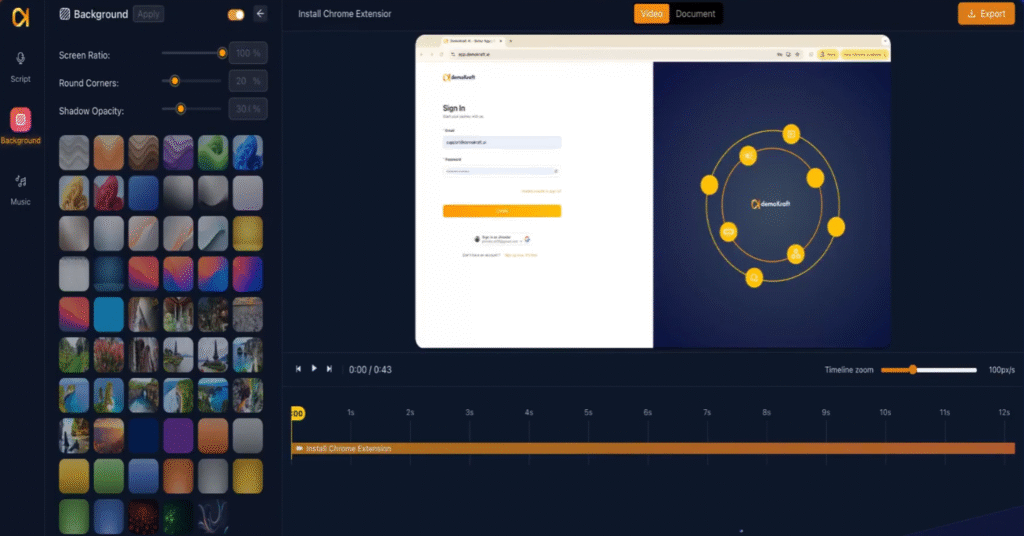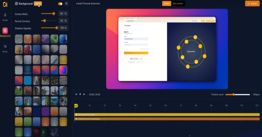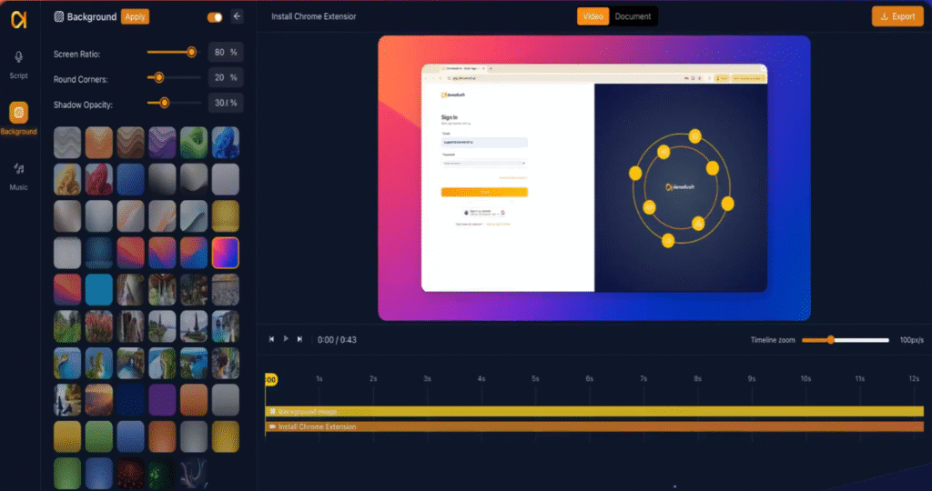 Fine-tune the screen ratio to fit your video’s layout, round the corners for a polished look, and adjust the shadow opacity. These settings enhance your video effects and contribute to a professional presentation.